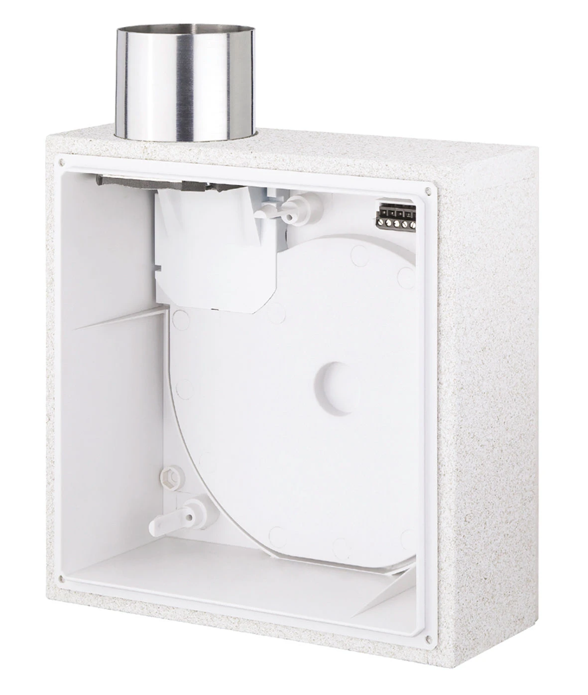 Unterputzgehäuse mit Brandschutz-Ummantelung K 90, Metall-Ausblasstutzen mit selbsttätiger Rückschlagklappe und Absperrung bei Schmelzlotauslösung. Ausblasstutzen seitlich, nach oben (Lieferweise), links oder rechts drehbar. Steckverbindung für elektrischen Anschluss herausnehmbar. Wieder einsetzbarer Klapp-Putzdeckel. Anschluss DN 80 mm. Zur Lüftung von Küche*, Bad oder WC. UP-Einbau in Wand, Decke und K 90 qualifizierte Lüftungsschächte. Anschluss von 1 oder 2 Geräten pro Etage bis zu 20 Vollgeschossen möglich.