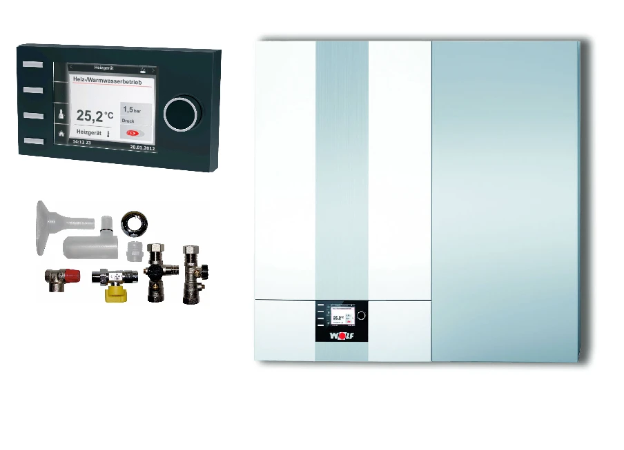 Wolf CGW-2-14/100 14kW Gasbrennwert-Zentrale mit 100 Liter Schichtenspeicher, Bedienmodul BM2 und Anschlusszubehör Aufputz